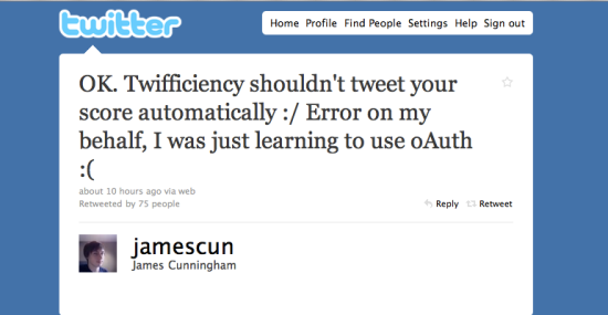 Before you sharpen your pitchforks, be aware that the programmer behind Twifficiency is a 17-year-old named James Cunningham, who claims to have built the app to teach himself about oAuth, with no intention of its going viral: