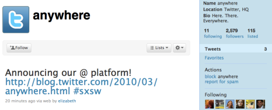 Update: In a new post, Twitter’s official blog provides an overview of @Anywhere, which mentions that one distinguishing feature of the platform will be that third parties can implement it via “a few lines of Javascript” rather than by resorting to Twitter’s open APIs.