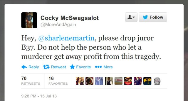 Hey, @sharlenemartin, please drop juror B37. Do not help the person who let a murderer get away profit from this tragedy. — Cocky McSwagsalot (@MoreAndAgain) July 16, 2013
