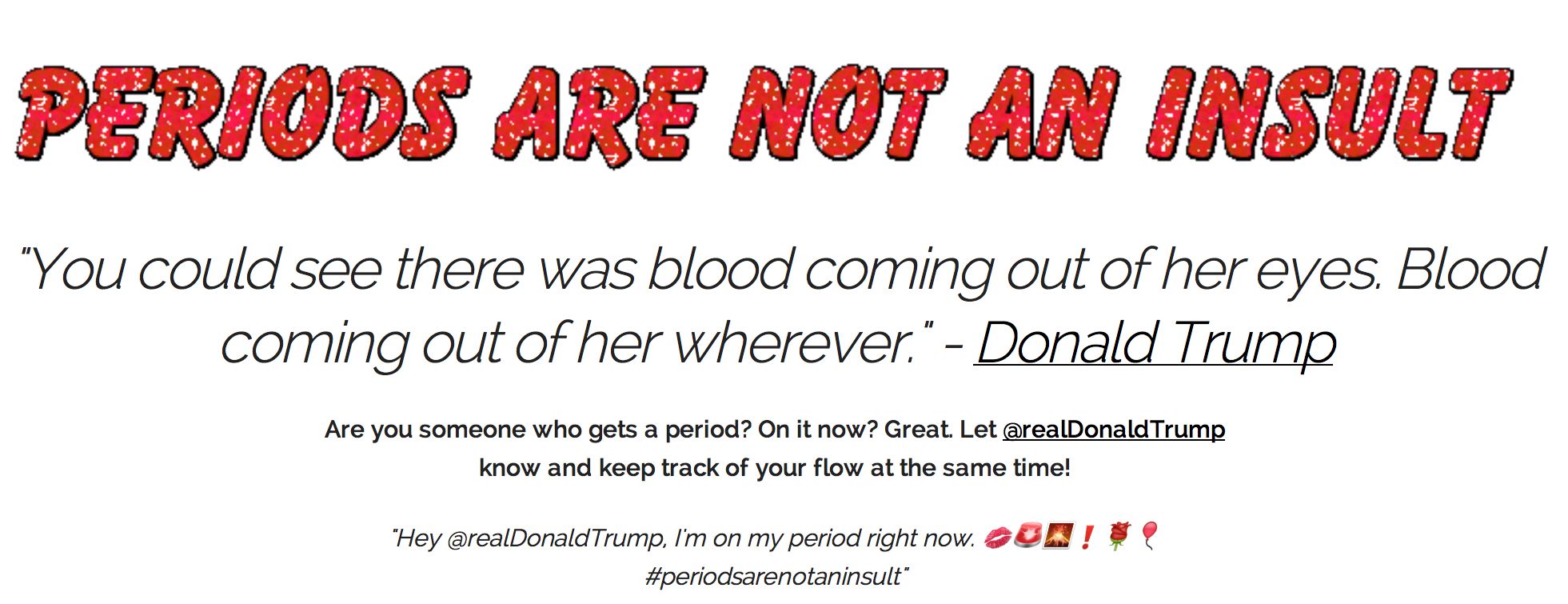 What’s great about this campaign is it’s totally inclusive, providing tweets for those of us who actually have periods (“Hey @realDonaldTrump, I’m on my period right now.” and “Hey @realDonaldTrump, I’m getting my period soon.”) as well as those who don’t get them anymore, or won’t get one ever (“Hey @realDonaldTrump, I don’t get a period but I also don’t use that as an insult.”). There’s also a section of the page that invites visitors to share their personal period insult stories (contributions will be featured on the site at a future date).