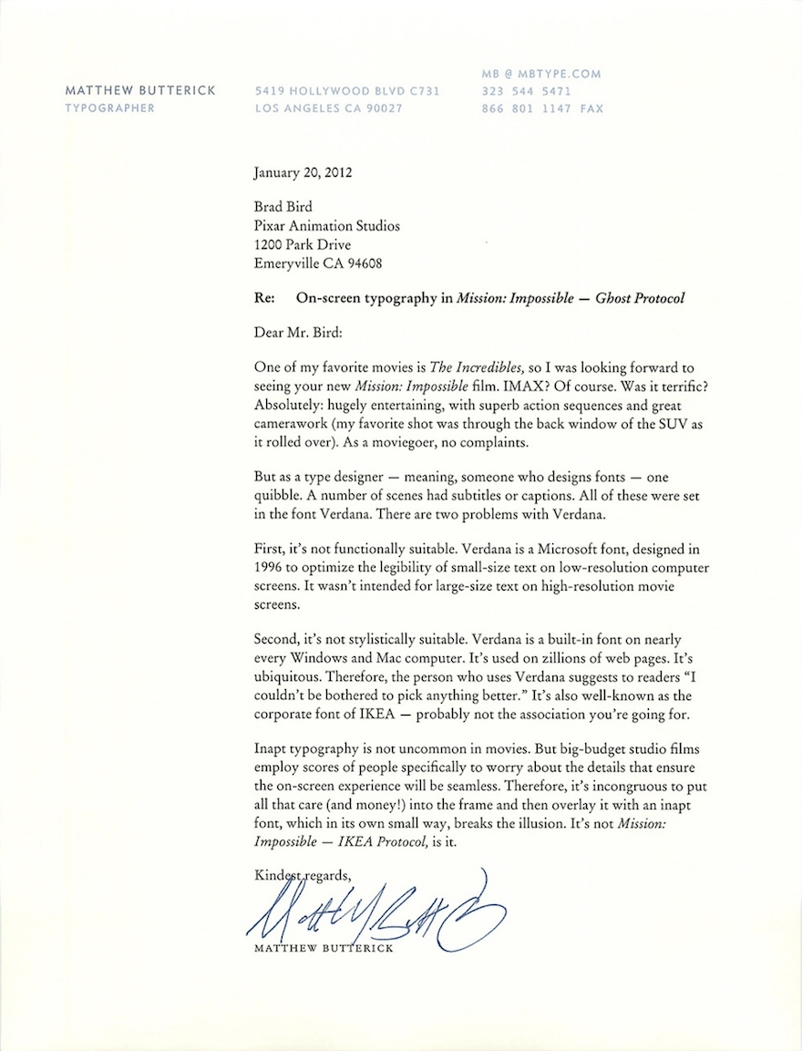 Matthew Butterick is very devoted to his job as a typographer, where he concerns himself with the design of fonts and finding just the right look for words. Apparently, Mr. Butterick is so very devoted to his job as he was unable to fully immerse himself in The Incredibles director Brad Bird’s latest film Mission: Impossible — Ghost Protocol due to a critical choice of fonts. It seems that during the film, the font Verdana made a few appearances which Butterick saw as a huge mistake. Obviously, he had to bring this to the director’s attention.