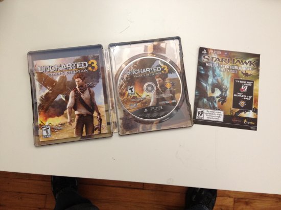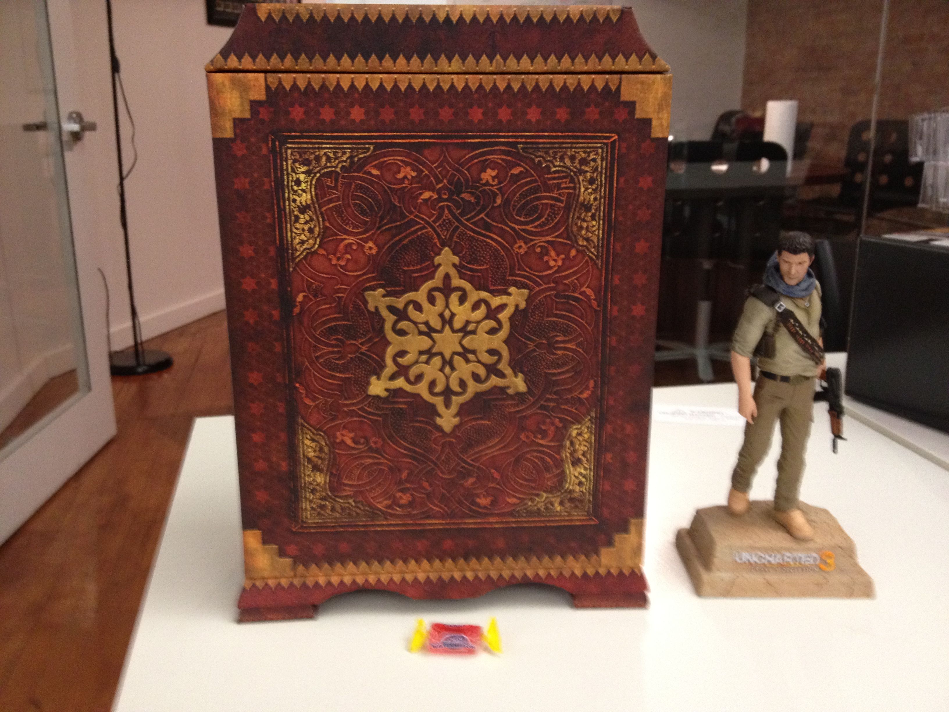 Yes, one of us here at Geekosystem pre-ordered and purchased the Uncharted 3: Drake’s Deception collector’s edition. Said person knew the edition came with Nathan Drake’s ring-on-a-necklace, his belt buckle, a steelbook (the actual thing that houses the game), and a Nathan Drake statue. What said person didn’t know, however, is how humongous the edition was in physical size. As he carried the edition back from GameStop, it felt like he just purchased a console rather than a single game. Read on below to see more pictures of the edition’s contents, and some more Jolly Rancher size comparisons.