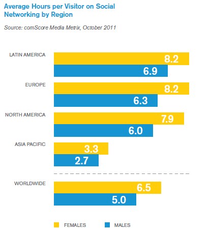 Ranked by number of hours dumped into social networking by region, Latin America stands at the top of the mountain, followed by Europe, North America, while Asia Pacific brings up the rear.