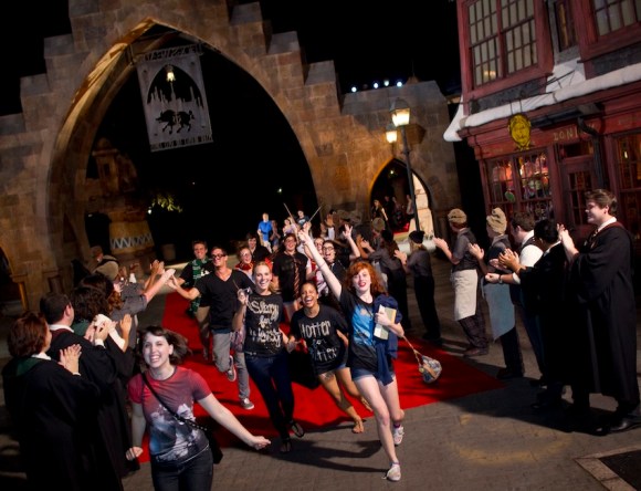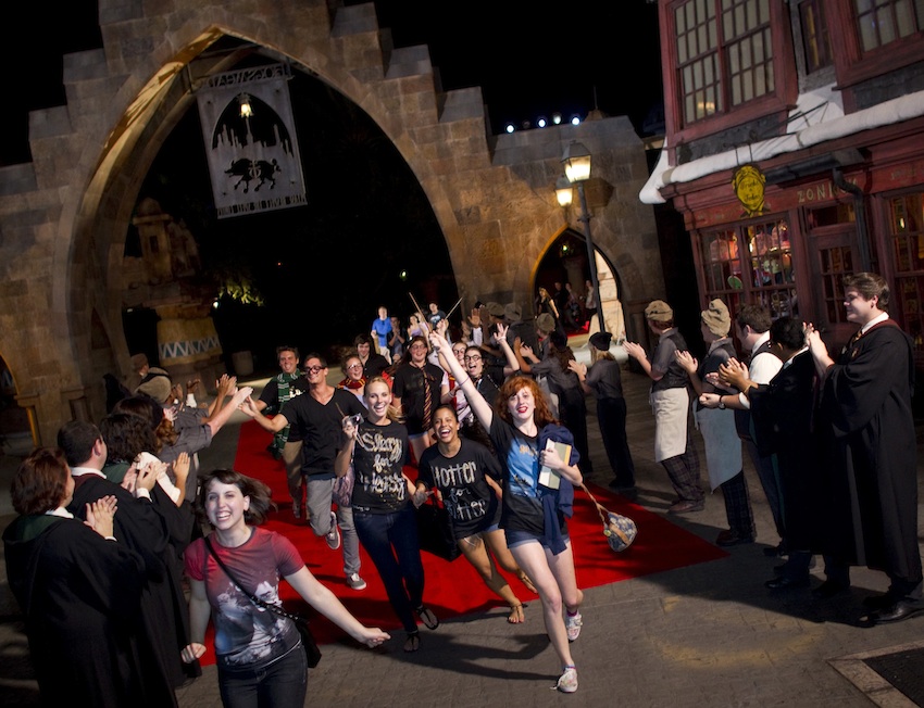 Upon the end of the film, the more than 3,000 people who had just watched the final Harry Potter movie were informed that from the hours of 3:00 to 5:00 AM, the Wizarding World of Harry Potter was theirs. They left the theater — the AMC Universal Cineplex 20, in which all 20 screens were showing the film — and walked a red carpet into the theme park.