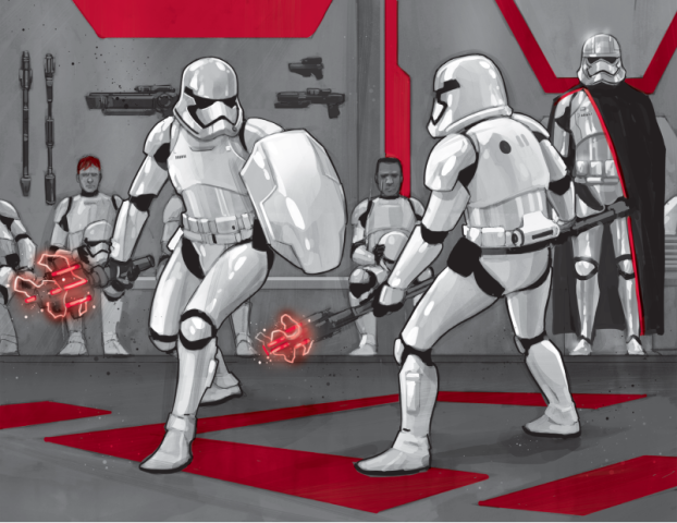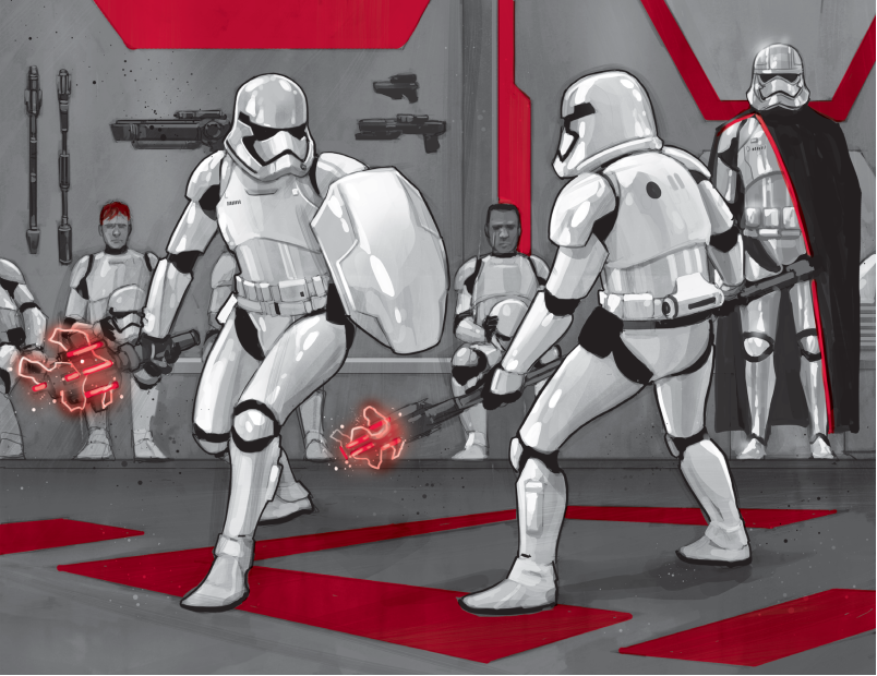 Many memes have been made from the brief appearance of this riot baton-twirling First Order stormtrooper; he’s been named TR-8R after his one line (“Traitor!”), and he even appears in several action figure sets (often paired with Finn, the “traitor” against whom he battles). According to Greg Rucka’s Before the Awakening, his actual identification is FN-2199, and his nickname is “Nines.” More importantly, though, who has the honor of playing this masked man in the movie?