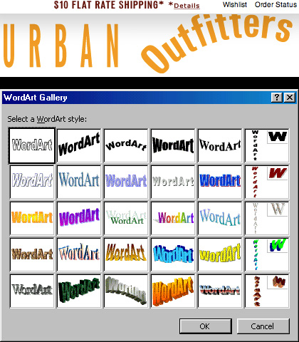Our friends at Styleite tip us off to the alarming redesign underway at UrbanOutfitters.com, now crowned with the logo you see up top. Compare to classic Microsoft Word text-styling feature Microsoft WordArt circa Microsoft Office 2003 or so, friend to children making science fair projects everywhere. Looks like style #8 and style #3 got together and decided to call it a day.