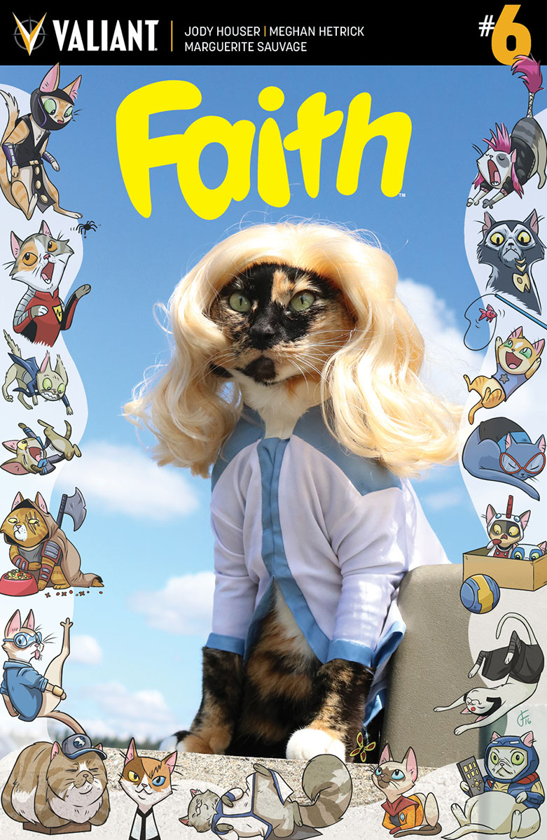 In collaboration with Cat Cosplay of the Feline Variety (who has already brought us so many wonderful cat cosplays–among them “Captain Pawsma” from Star Wars: The Force Awakens), Valiant is featuring kitties who are dressed up as ten of their most popular and recognizable characters–including the new ongoing series Faith. Each of the covers are based on an actual cover from any one of Valiant’s featured series.