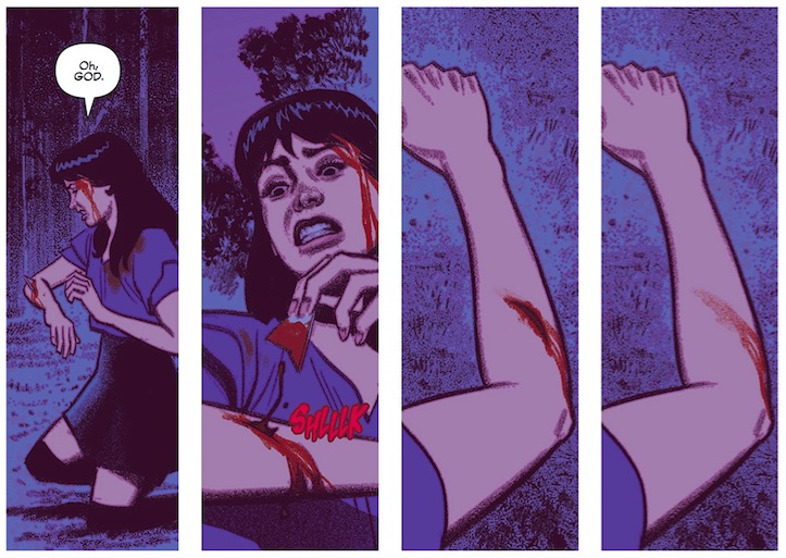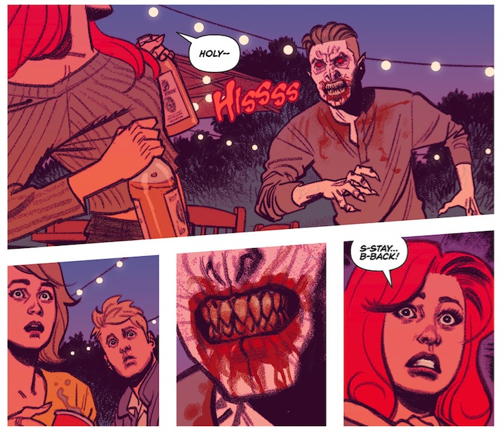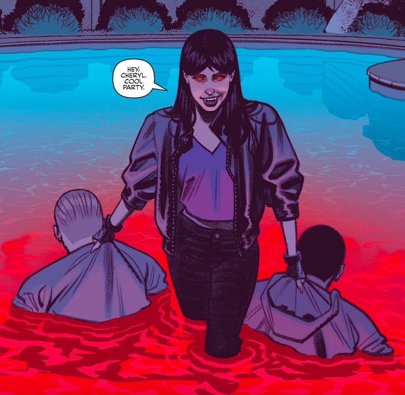 In Vampironica #1, a red-eyed, be-fanged Veronica rescues Cheryl Blossom’s party from a horde of vampires, and we learn how Veronica herself becomes one of the undead. The bloodsuckers who crash the party are feral, terrifying creatures in the throes of bloodlust, but the suave gentleman who visits Lodge Manor maintains an aristocratic façade, his true nature only revealing itself to Veronica at the last moment. Veronica likewise seems able to retain her blue-blooded disposition, despite having developed a taste for the real thing. These archetypes speak to the dual nature of vampirism in mythology and literature, where allure and revulsion, desire and restraint go hand-in-hand.