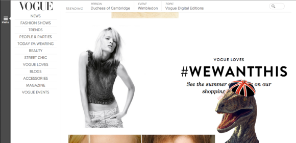 Type the Konami Code in on the homepage of the British Vogue website, trust me. You will not be disappointed. When you do, you can see an array of very fashionable velociraptors in a variety of hats, that an unknown genius has arranged to slide across the webpage in response to the videogame cheat code. I like to think of them as the residents of Jurassic Park Avenue, strolling around in wonderfully coordinated ensembles, photo-bombing unsuspecting models, and gnawing on intestines. Head past the jump for more screenshots from the British Vogue website.