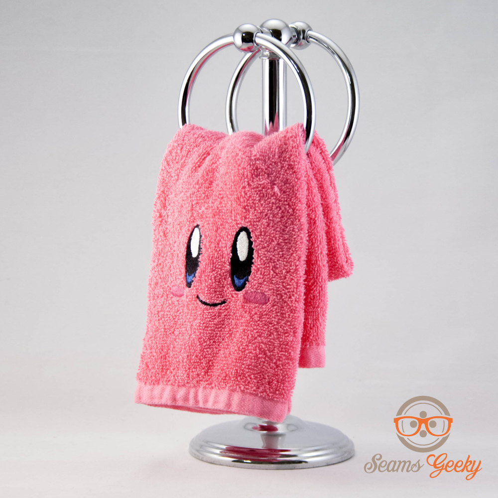 Hand towels, not usually on anyone’s list of cool, exciting things. I think of the towel family, beach towels are probably the most likely to bag that particular spot. But I defy you to look at the Kirby face embroidered on the towel above and not feel a need to own it.