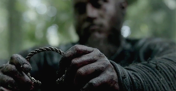 The South Carolina-based company has been around for a while, mostly serving that historical reenactor set, cosplay, and the occasional Ren Fair goer. But these gorgeous, moderately priced ornaments possessed the necessary historical bona fides to catch the eye of Vikings‘ designers. Hansen shipped off his bronze dragon-head bracelets to the show on a whim. It quickly became a featured object of desire, worn by Ragnar and Aethelstan. Viewers have seen plenty of close ups as the “ring” or “arm ring” (a sign of favor from your liege in Viking culture) got returned to Ragnar in season two. Hansen also sent a couple of wolf-head arm rings.