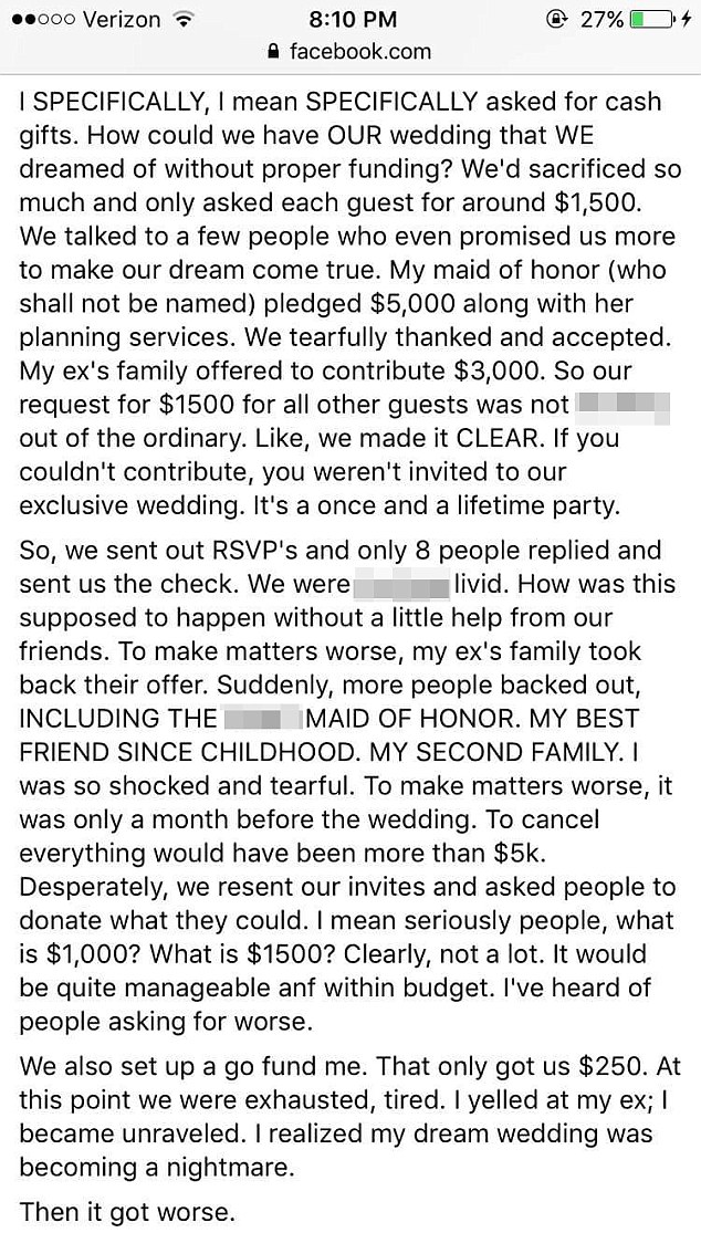 It’s the mix of totally outlandish and spoiled entitlement that makes this post jaw-dropping. It’s the kind of thing that becomes viral because you have to read it to believe it, and then you have to text it to all of your friends: “Can you believe this?”