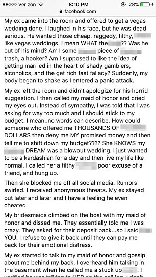 Susan just wanted to have her dream wedding. She encountered some bumps along the way, and took to Facebook to complain after the wedding was canceled. As you read her account, you start to realize why that came about.