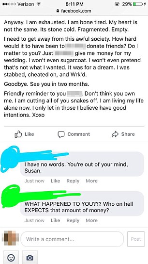 Well, it turned out that many people were unwilling or unable to fork over such a large amount of cash on demand. After only 8 people gave the couple $1,500, they turned to GoFundMe, to no avail. At this point Susan’s anger at being denied her dream wedding—she just wanted to be a Kardashian for a day, you see—really starts to go off the rails.