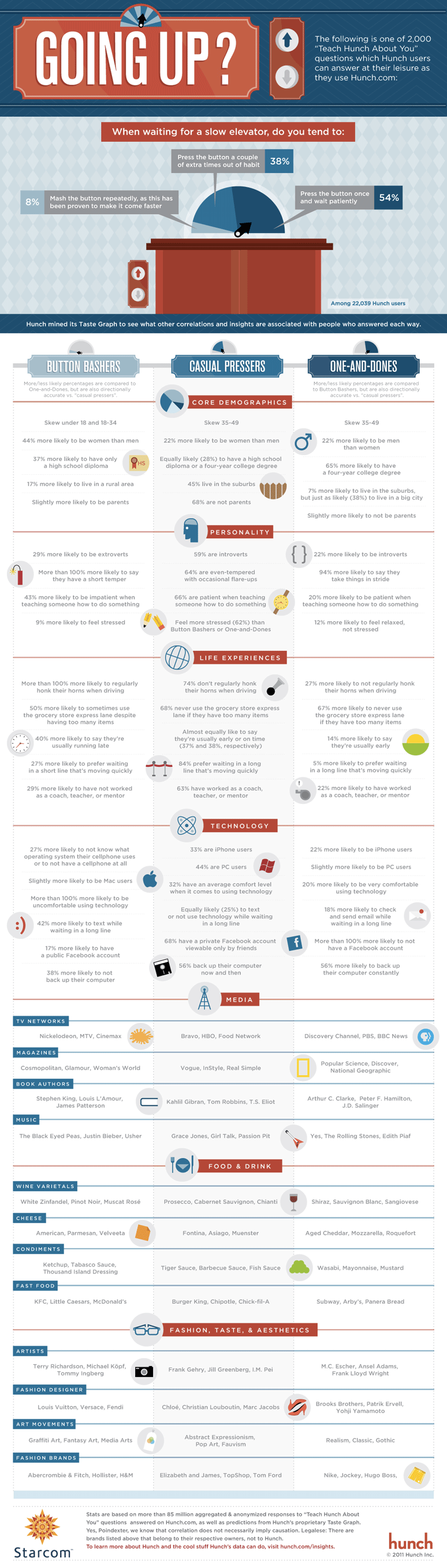 Along with complaining about Mondays, another seeming cliche regarding everyone’s office is that the elevators in the building are terrible, something which I deal with on a daily basis. Column Five Media and Hunch got together to find out how people wait for the elevator, and what it says about them. Do you frantically push the button even though it doesn’t do anything after the first push? Do you press the button once then take out your smartphone and forget you’re waiting for the elevator? Do you want to know how either of these strategies affects the likelihood of you becoming a parent? No, really. That information, along with other interesting elevator waiting tidbits, can be seen infographically below.