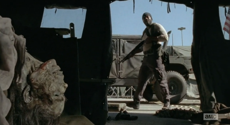 Meanwhile, some guy named Bob wants to come on the run too. Sasha tells him it’s “only been a week” since they found him on their own, but he wants to earn his keep. He was also a medic in the army, somebody else says. Yeah, new guy’s probably gettin’ eaten too.