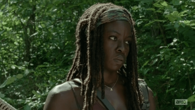 Daryl finds a piece of jasper on the ground as they’re walking. Michonne says it brings out the color of his eyes. God damn it, Daryl. Is your dick magic or something? He says something to the effect of “Hey maybe you should actually stay in one place for more than three seconds and you’ll learn other people’s names and stuff,” and Michonne makes this face.