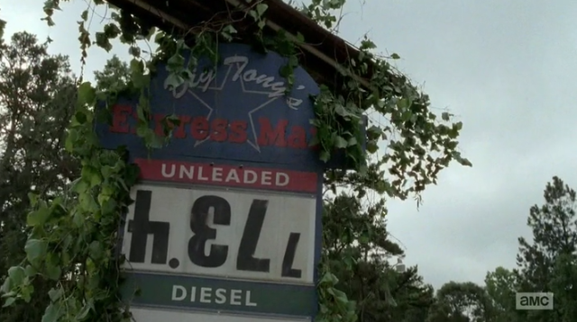 It’s one thing to write in the dust on a car, but to rearrange the letters on your gas station sign in the middle of a zombie apocalypse? Dude. I hope that asshole thought he was real clever right as he was getting his face gnawed on. Nobody on the supply run team notices, either. They’re too busy trying not to die.