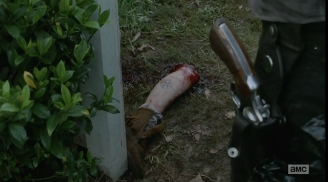 If you were expecting an explosion, you clearly don’t know this show very well. Walkers jump out of the brush instead. Tyreese is the only one left struggling with one, and only because his was stuck in the brush and he pulled the sucker out and on top of him. Yeah, Tyreese has got a seriously fucked up death wish right now. “Why the hell didn’t you let go?” Michonne asks. Symbolism!!