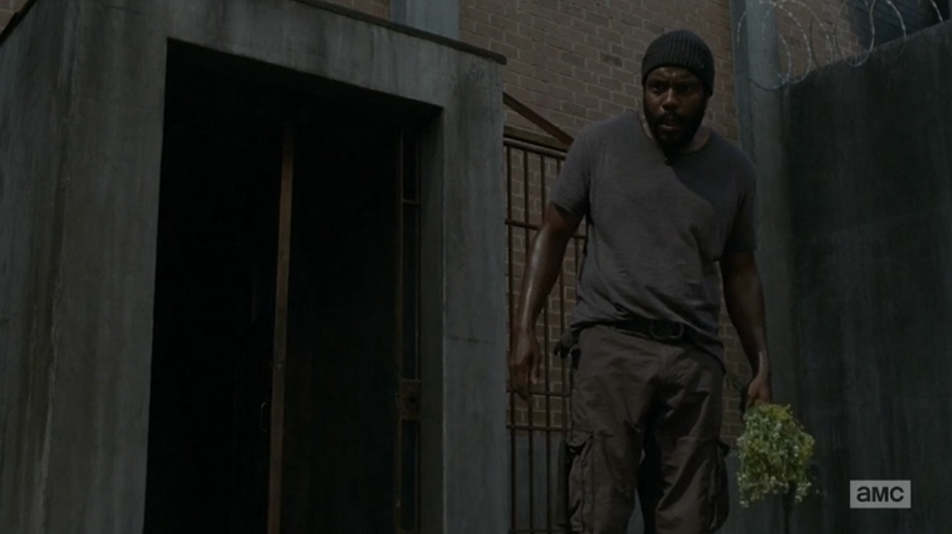 The council has a meeting to figure how best to separate everyone who could have been exposed to the virus. They decide that everyone still living in D to A (which is Death Row — oh, irony) while they clean up, and then suddenly everybody hears Karen coughing from across the hall. KAREN. Tyrese is going to take her back to his cell to “rest” (AKA sing creepy songs to her and then make out) but they all talk him out of it and send her off to some clean cells in the tombs, along with some other guy who’s been coughing — David, I think. Carol and Daryl share some concerned words with each other and I’m pretty sure he calls her “babe” before he walks off. I would tell them to just make out already but that tends not to go well for a lot of people on this show.
