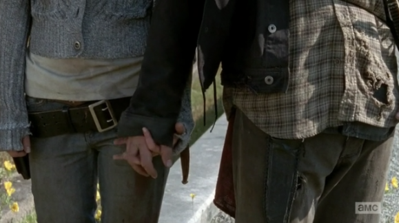 Daryl and Beth make it to a cemetery, but Beth needs to sit down — her foot is still injured. Naturally Daryl offers her a piggyback ride because oh my god make out already. Beth comes across a gravestone that says “Beloved Father” and pauses, so Daryl picks some weeds and lays them across the grave, and then they hold hands.