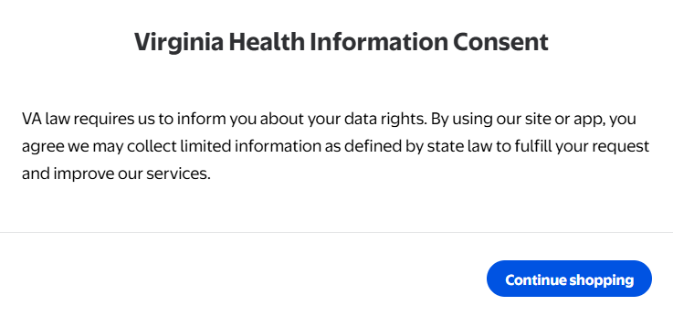 As of Wednesday morning, Walmart’s website warned Virginia shoppers, “VA law requires us to inform you about your data rights. By using our site or app, you agree we may collect limited information as defined by state law to fulfill your request and improve our services.”