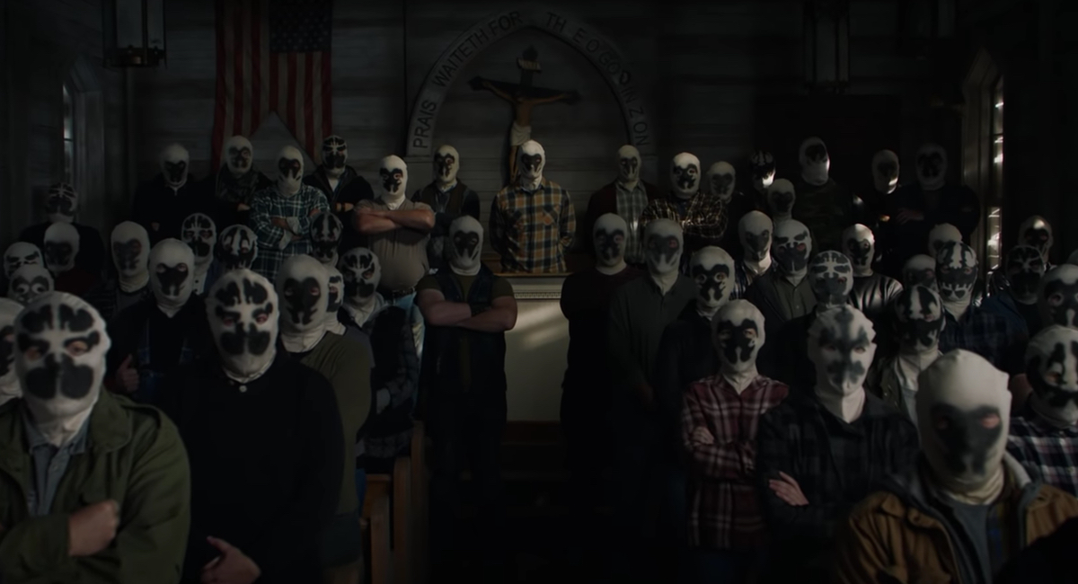 In the show, there is a white supremacist group called the “Seventh Kavalry” in Tulsa that has taken to Rorschach’s black-and-white mask, and they are acting up in response to President Robert Redford’s push to implement reparations to those affected by past racial injustices. That absolutely makes sense, since Rorschach, in the comics, is outwardly (checks the list) racist, homophobic, sexist, and a total and complete fascist. Alan Moore literally wrote him to make fun of The Question, Mr. A, and a bunch of other Steve Ditko comic characters that the artist/writer used to promote his Ayn Randian ideals.