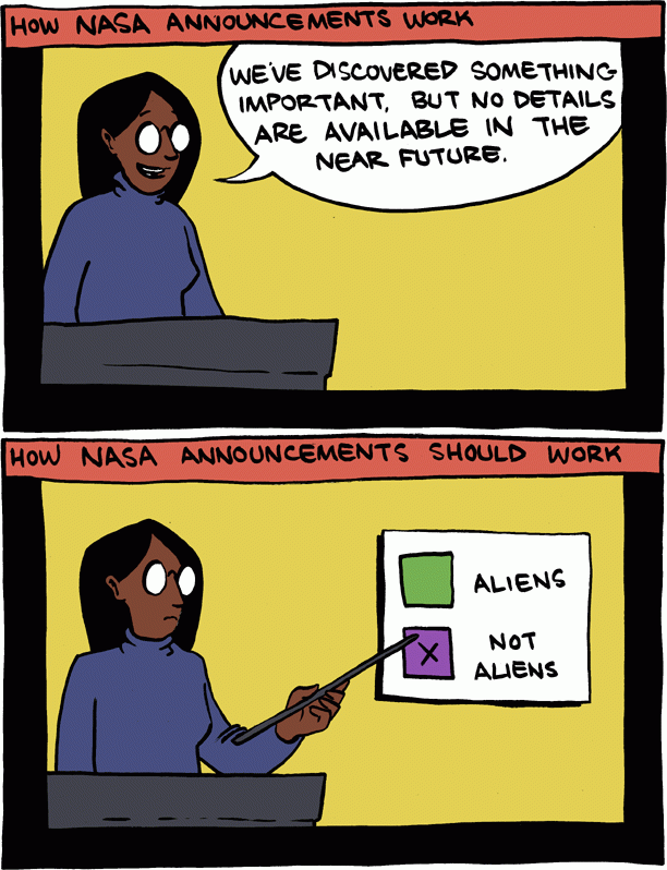 Look, last week NASA got everyone excited when they said they might have found something “earthshaking” on Mars. Then they gave a press conference and told us they found ice…on Mercury. I hereby direct NASA to the above comic strip for all future announcements.