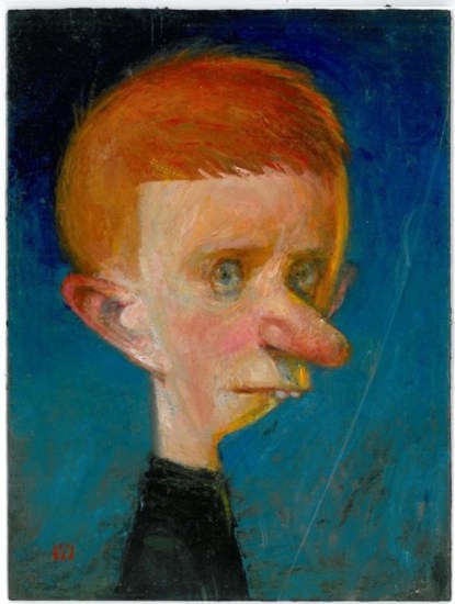 The 6’x8′ oil on board is the character Petey Otterloop from Richard Thompson’s comic strip Cul de Sac. Thompson revealed that he had Parkinson’s disease in 2009.