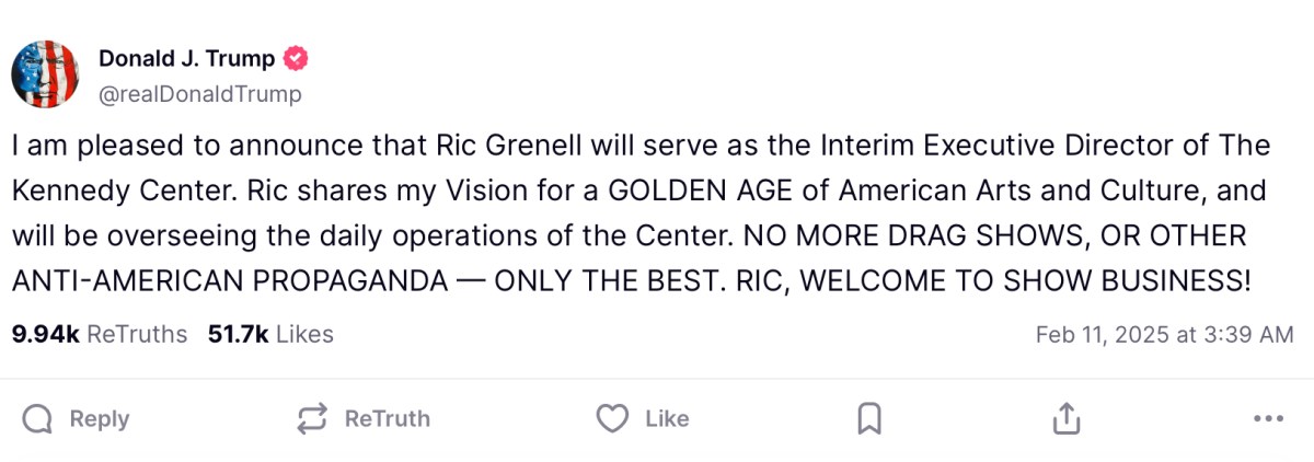 There’s no better place to look than the president’s Truth Social account. He appointed Ric Grenell, his foreign policy advisor, as the interim executive director of the Kennedy Center. ” Trump’s social media post said the quiet part out loud.