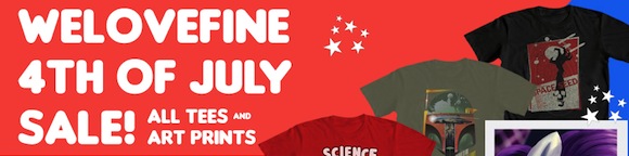 We thought you might like to know that WeLoveFine is having a little sale tomorrow on all t-shirts and prints. That means 10-20% off on oh, a bunch of beautiful reproductions of Adventure Time title cards, Hanie Mohd’s Marvel superheroines in ballgowns, or, if you’re in a patriotic mood, maybe just some art deco Captain America. But the sale’s only effective if you enter the right codes at check out, so come on behind the jump to get all the details.