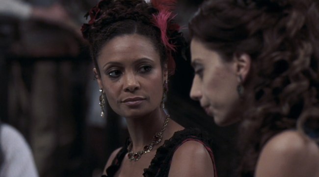 This is a total video game role for a woman. We’ve got the Virgin/Whore dichotomy with Dolores and Maeve, as stated. But by introducing the Snake-Lady gunslinger—and, later on, by allowing Dolores to “change” her role by putting her in men’s clothes and giving her a gun—we get to see the Strong Female Character archetype that’s classic to video games. This trope is a little harder to push back against, since of course, we whiny feminists are supposed to be satisfied that at least a female character gets to carry a gun, and shouldn’t that be enough for us? But I’m not sure the beautiful gunslinger archetype is any more empowering than these other two archetypes, particularly since they’re still always conventionally attractive, young, and – on Westworld, at least – presented as an object for men to ogle.