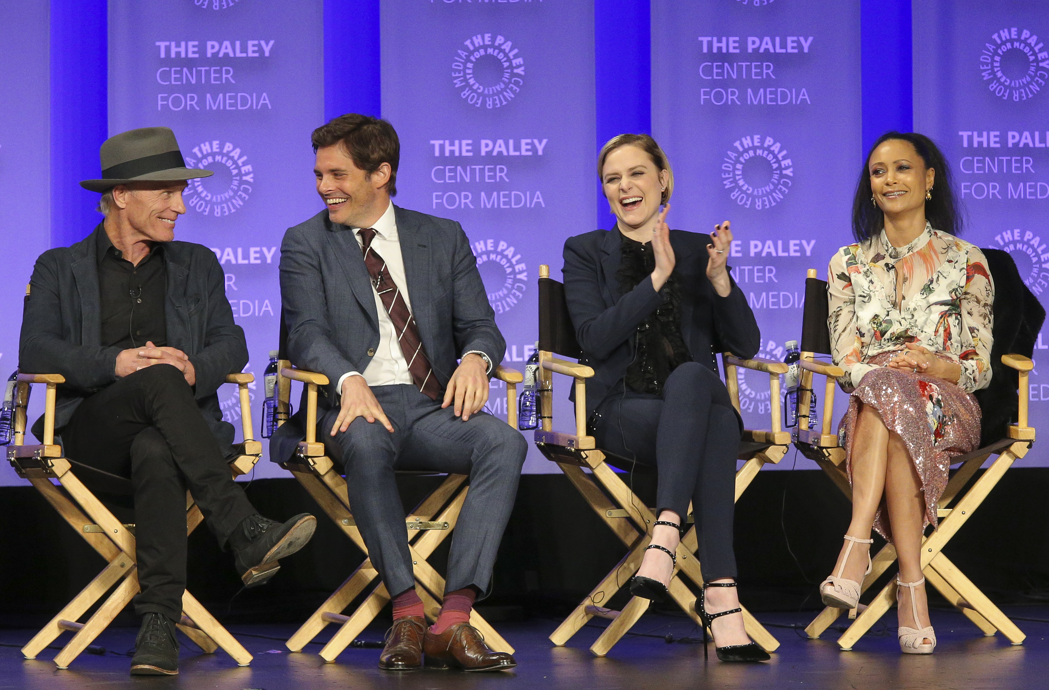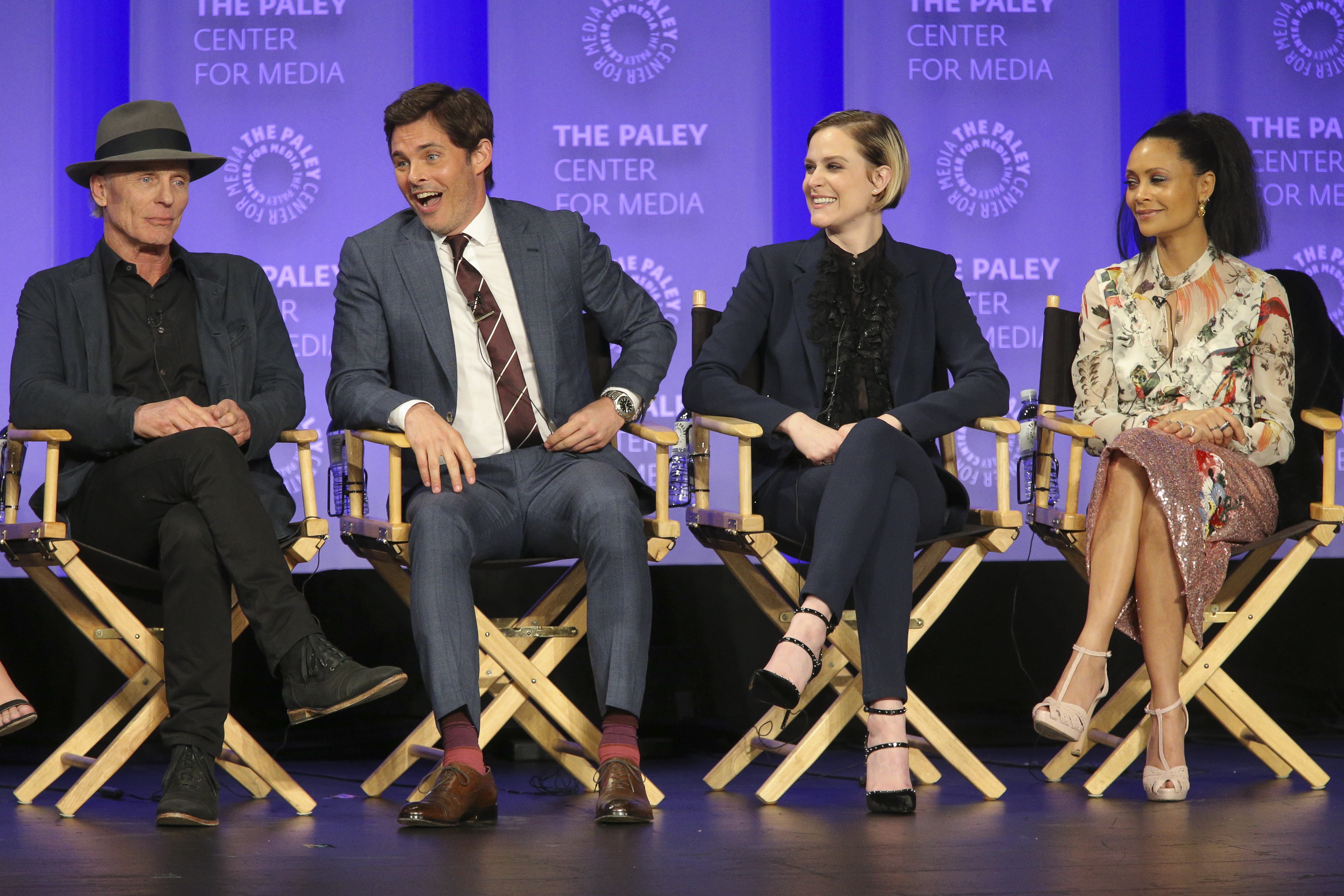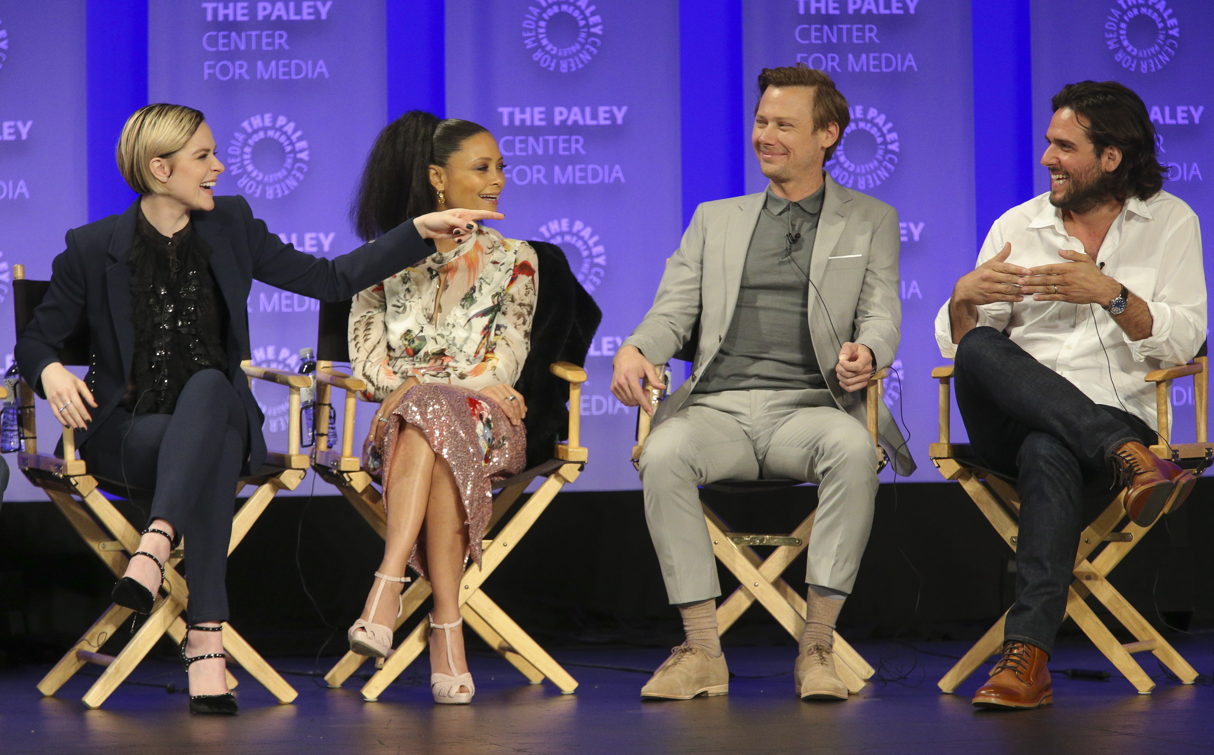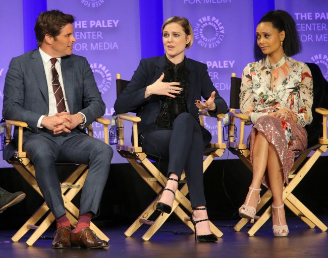 - Everyone thinks the show is a better experience if you let it work on you, rather than trying to figure out the twists before they’re revealed. Marsden says, “When you let the show come to you…it’s a more satisfying experience in my opinion.” Nolan thinks the fan engagement in trying to figure things out is great on one hand, but on the other hand, he wishes people wouldn’t “guess a twist and blog about it…you spend two years working on something…” Joy suggests people speculate with their friends in real life rather than post things publicly online, but that ultimately “I don’t believe knowing the end spoils things.” She likens it to revisiting favorite films and shows, or rereading favorite books. Storytelling is storytelling, and people generally appreciate a story well told even if they know how it’s going to end. Nolan jokingly suggests writing our speculations down and mailing them to ourselves registered mail, so that when the season is over we can open the envelope up and brag then. Meanwhile, Thandie loves watching the fan responses on Twitter, but is amazed that people can watch a show and tweet at the same time.
