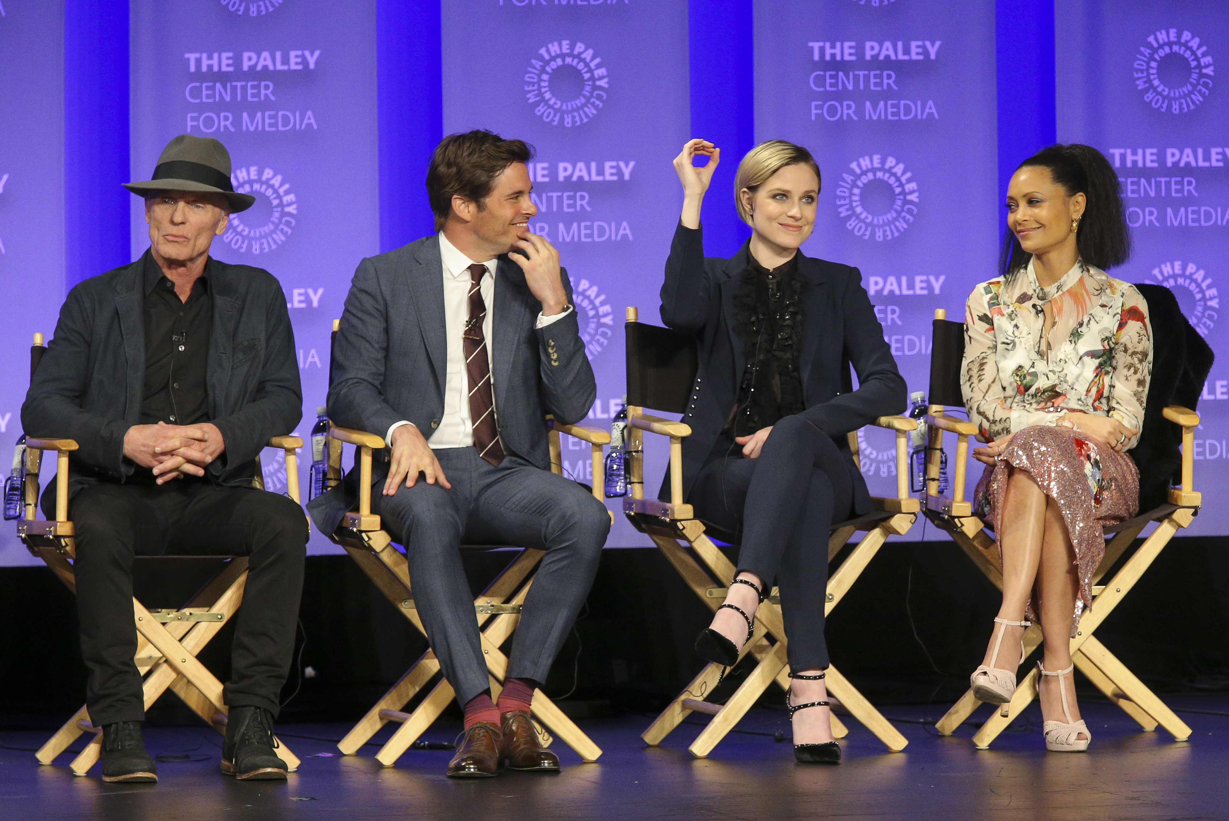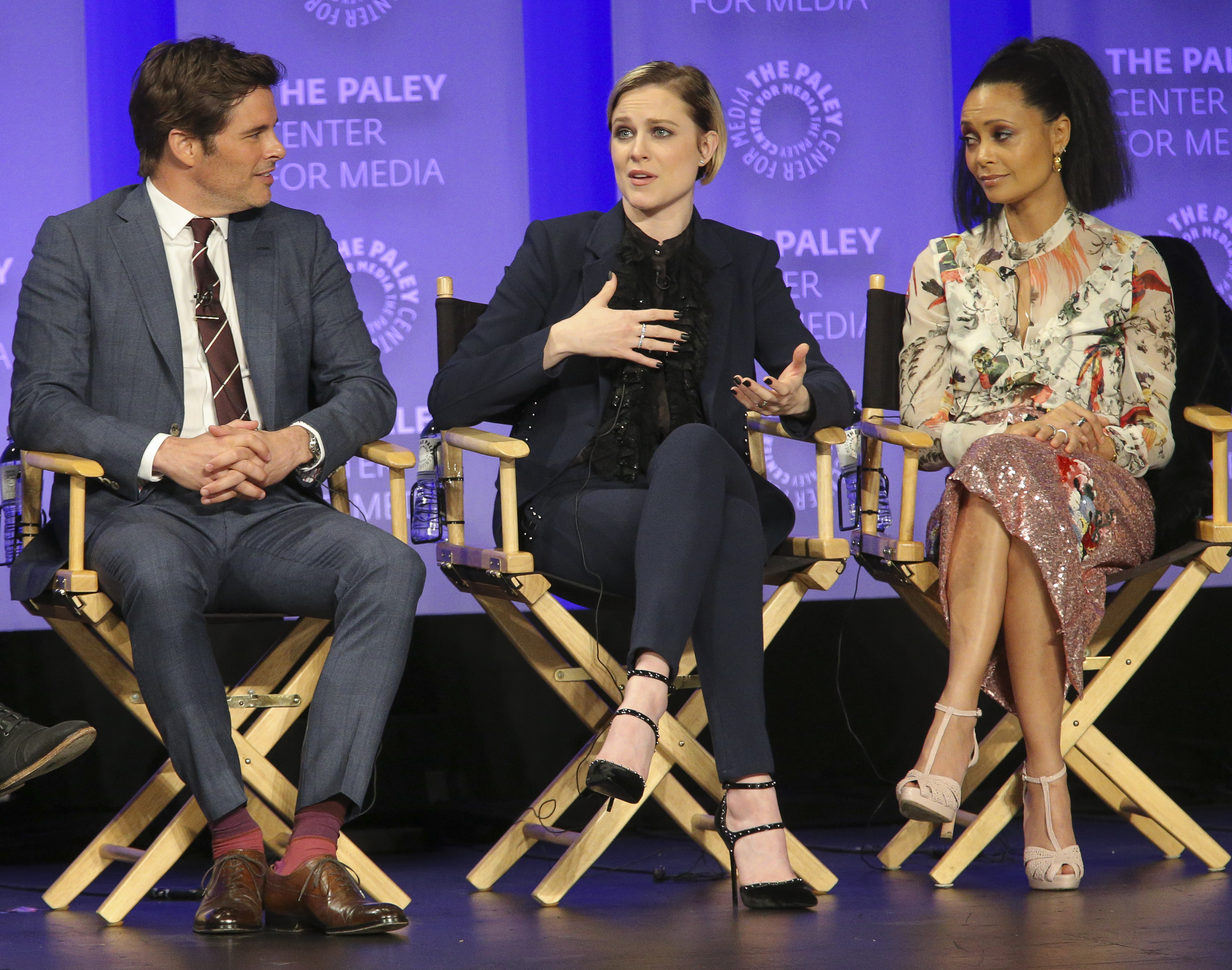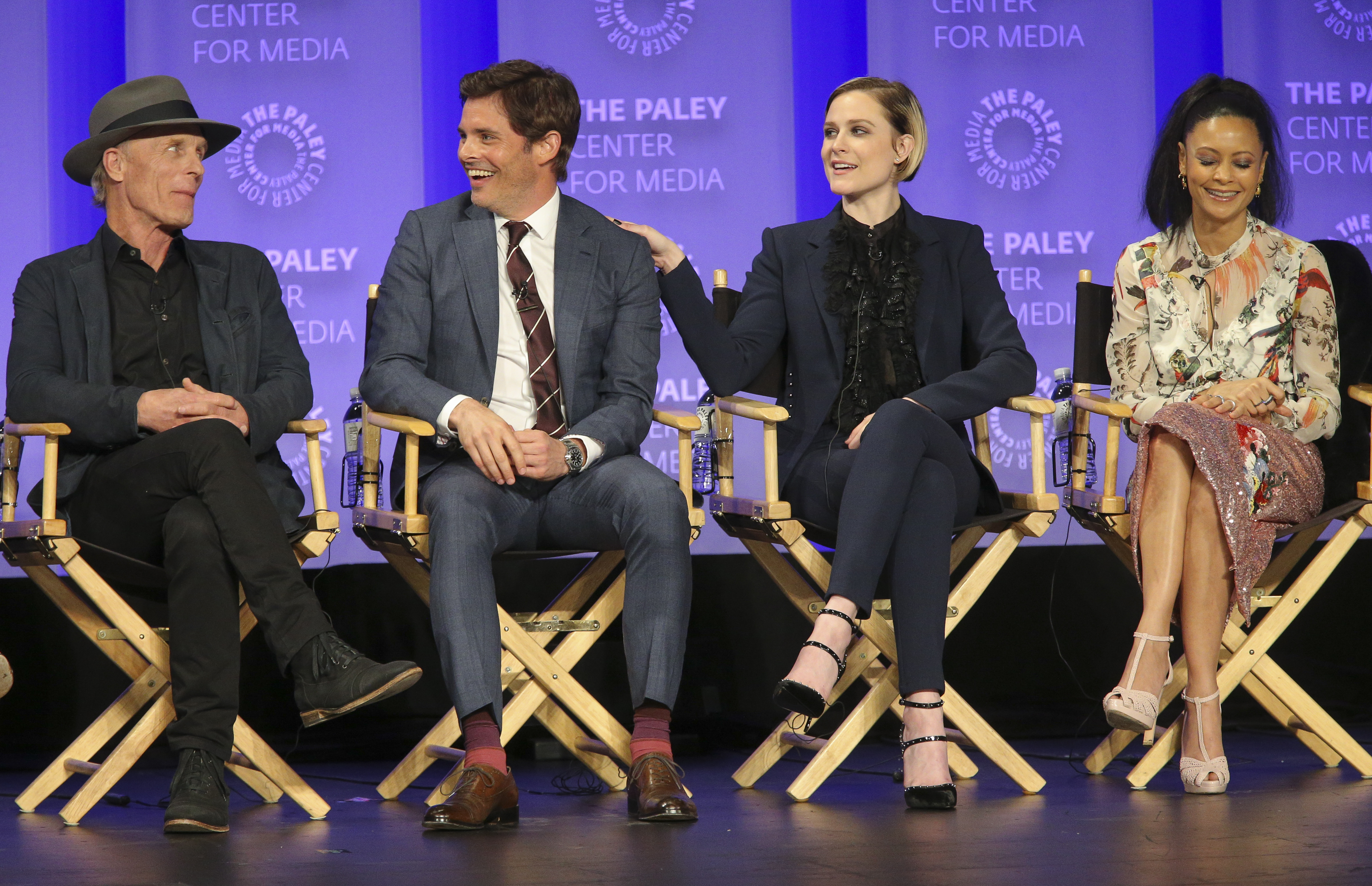 - Everyone thinks the show is a better experience if you let it work on you, rather than trying to figure out the twists before they’re revealed. Marsden says, “When you let the show come to you…it’s a more satisfying experience in my opinion.” Nolan thinks the fan engagement in trying to figure things out is great on one hand, but on the other hand, he wishes people wouldn’t “guess a twist and blog about it…you spend two years working on something…” Joy suggests people speculate with their friends in real life rather than post things publicly online, but that ultimately “I don’t believe knowing the end spoils things.” She likens it to revisiting favorite films and shows, or rereading favorite books. Storytelling is storytelling, and people generally appreciate a story well told even if they know how it’s going to end. Nolan jokingly suggests writing our speculations down and mailing them to ourselves registered mail, so that when the season is over we can open the envelope up and brag then. Meanwhile, Thandie loves watching the fan responses on Twitter, but is amazed that people can watch a show and tweet at the same time.