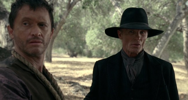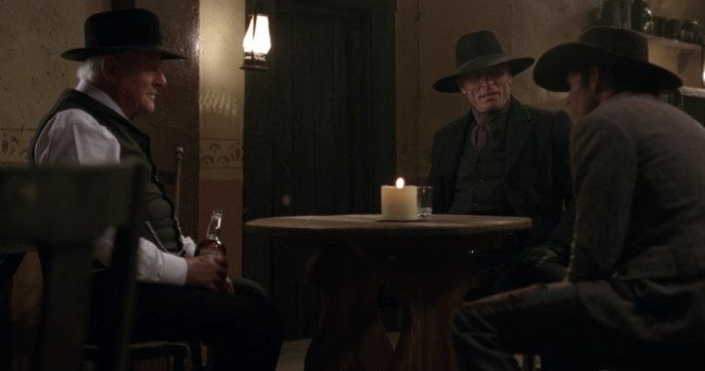 Dolores stands in a graveyard just outside a town called Pariah, which is apparently the den of all sin in Westworld (and that’s saying something!). She has more flashes of imagery she may have experienced, and we hear her voice ask the one she’s been hearing — Arnold’s voice? Bernard’s? — to help her find it. William pulls her back to reality, saying that he heard her talking to someone. She says “It must’ve been the wind,” and she goes into town with him and Logan. The “Confederados” (Confederate soldiers who refused to accept the Civil War was over) are gathered in Pariah, and Logan wants to join in with them to get to the part of the park where there’s a war on. [Maddy: Yet another historical plot-hole, among many such plot-holes. Is the Civil War still in progress, within the fiction of the theme park, or is it over? Seems like it depends which part of Westworld you’re in, and who you ask. Lee Sizemore doesn’t seem like a particularly organized narrative designer!]
