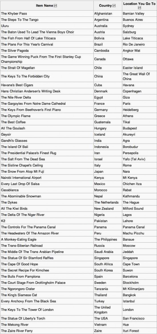 Here, via Wikipedia, is a complete list of fifty things that Carmen Sandiego stole in Where in the World is Carmen Sandiego?: