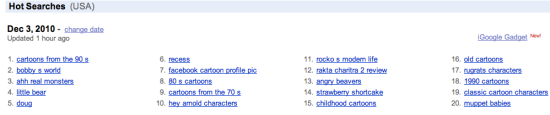 If you’ve been on Facebook lately, you may have noticed a recent wave of cartoon characters among your friends and acquaintances’ profile pictures. And it’s not just you. On Google Trends, Google’s snapshot-of-the-web service which charts hot search topics, nineteen out of twenty (!) of the top searches are for various types of childhood cartoon character, many narrowed down by decade (“80s cartoons”; “cartoons from the 90s”) or specific shows (who knew Bobby’s World was so popular?).