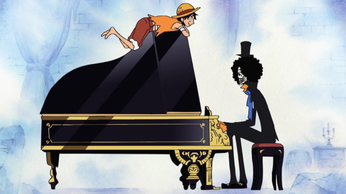 At the banquet, Brook begins to play the piano, and Luffy pops on top as he listens, very Lucy-and-Schroeder-like. We learn Brook’s incredibly sad backstory: he was originally a member of the Rumbar Pirates, a jolly and music-loving crew who were tailed by and became close to a baby whale named Laboon. The crew was forced to leave Laboon, who would grow to an enormous size, with a friend at the onset of the Grand Line.