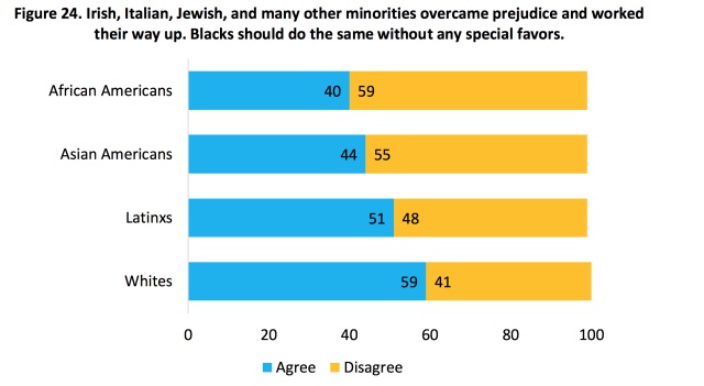 As the 44-page survey continues and delves into more issues it is clear that there isn’t just a divide between white and blacks, but blacks and other groups of POC. One of the biggest myths is that all minority groups are automatically allies because they share in oppression from whites. Being oppressed doesn’t teach you a better person, it teaches you how to oppress, especially if you can promote your own group’s needs at the expense of others. As sad as it to admit, we can not assume that all groups of POCs are natural allies to each other. The survey also did not reach out to Native Americans.