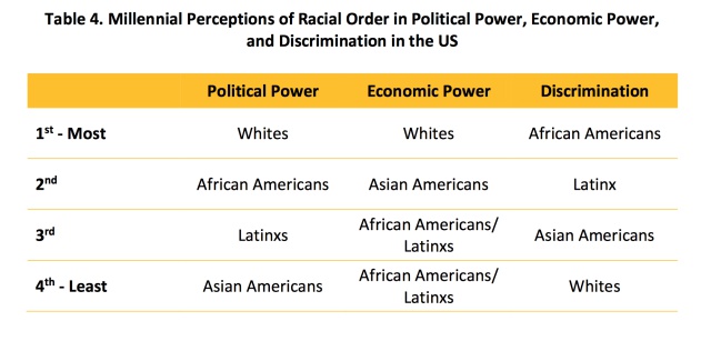- Racial Order. Millennials believe African Americans experience the most racial discrimination in American society but also have the second-most political power behind whites. Whites are cited as having the most economic and political power overall.