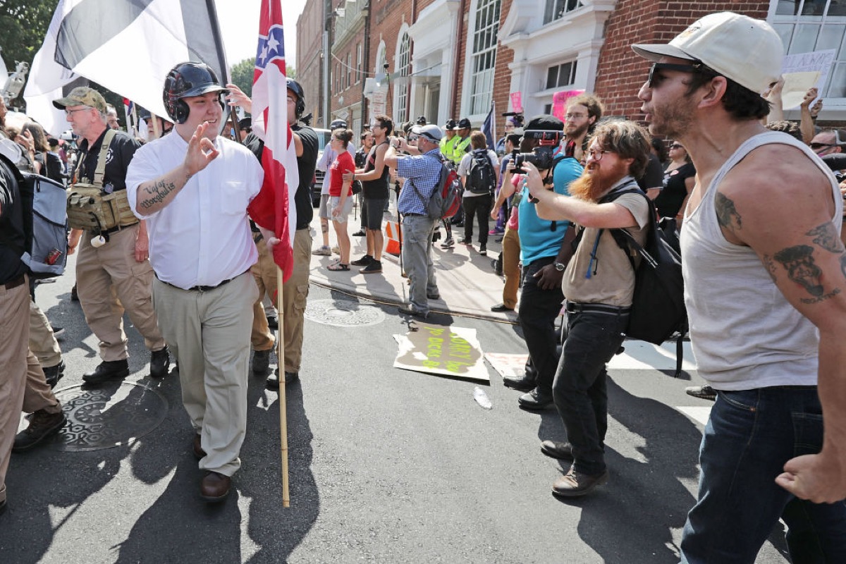 [featured image: Hundreds of white nationalists, neo-Nazis and members of the ‘alt-right’ are confronted by protesters as they march down East Market Street toward Emancipation Park during the ‘Unite the Right’ rally August 12, 2017 in Charlottesville, Virginia. After clashes with anti-fascist protesters and police the rally was declared an unlawful gathering and people were forced out of Emancipation Park, where a statue of Confederate General Robert E. Lee is slated to be removed (Chip Somodevilla/Getty Images)]