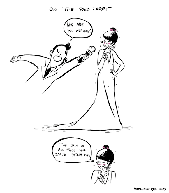 It’s awards season, so in those moments where you can’t believe the tv guide said the broadcast started at seven and that meant an hour of actors being interviewed about their roles and actresses being interviewed about their dresses before you actually stand a chance of finding out who won best Hair and Makeup (it’s The Hobbit, seriously, thirteen dwarves), just repeat Madéleine Flores‘ comic to yourself. You can see more of her stuff here, and even buy it here. Yes, even her take on dressing for your body type.
