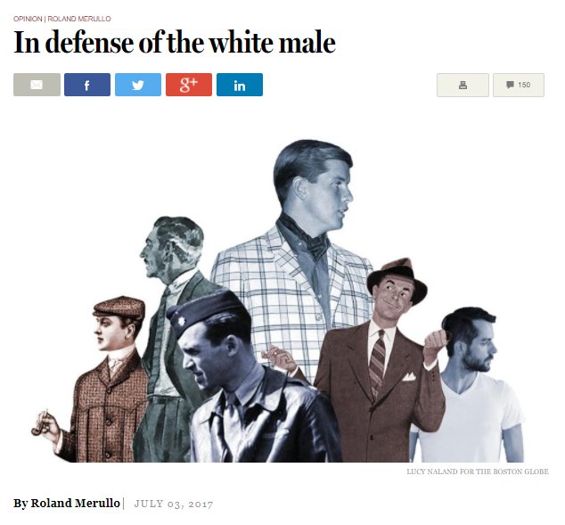 The Boston Globe’s Roland Merullo posted a “think piece” just before the July 4th holiday called “In Defense of the White Male.” You know, because no one ever comes to their poor, defenseless, marginalized aid.