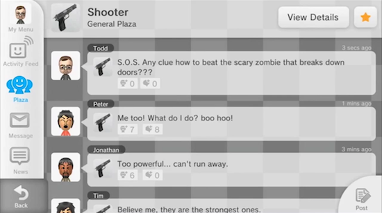 The prime example of Miiverse shown in Nintendo’s very weird (almost in a good way once you get about a third of the way through) video, was an actor playing a zombie game, getting stuck at a particular part, and popping up Miiverse in-game (as one would do with the PSN XrossMediaBar or Xbox Live’s Dashboard), and posting in a thread about the game (or the player’s own buddy list? It wasn’t clear) asking for tips.