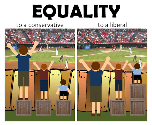 Well, no. As we see, just because everyone has a box doesn’t mean everyone gets to enjoy the baseball game. One box helps people who already have the privilege of height, but for those who don’t, they need more than one box, or they miss out. When we talk about equality, we’re talking about equality of access. Equality of participation. We see this in the “Liberal” image on the right, where the smallest child is given two boxes, which is more boxes than the others have, but now that small child can see just as well as they can. That’s the equality we need.
