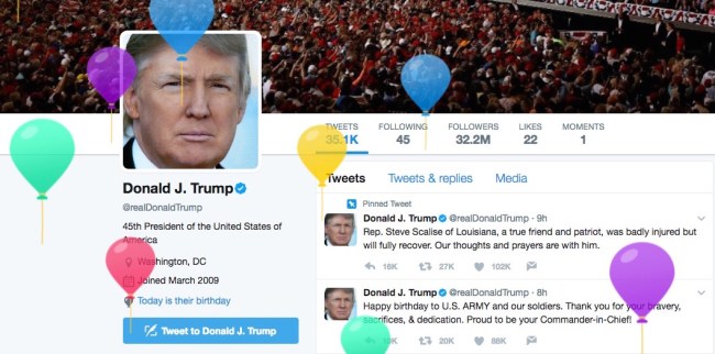It’s more than a little disconcerting to see Twitter throw birthday balloons up on his account, isn’t it? Right over a message about today’s horrific shooting, no less.