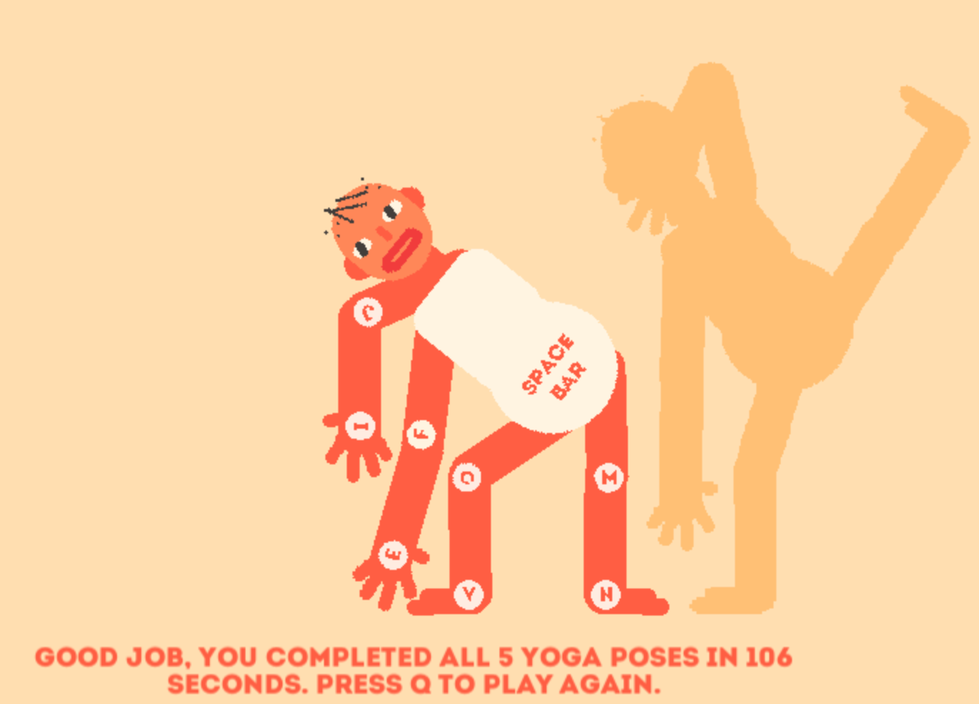 The game’s controls are not unlike QWOP, and you manipulate the character’s joints with your keyboard as he topples over himself and bends in different directions. Positions, which you have to hold for a set amount of time in order to clear them, include the “Frog Stick Pose,” the “Happy Baby Pose,” and the “Fish Moon Pose.”