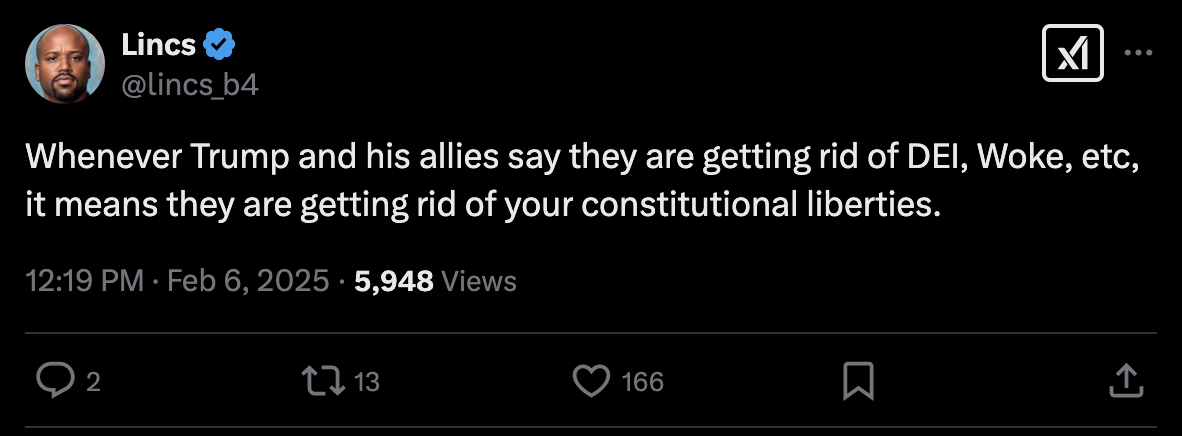 However, all ridiculousness aside, there is an even more insidious side to this as well. “Woke” is a broadly ambiguous term, but to people like Trump it boils down to, as X (formerly Twitter) user Lincs said, “Whenever Trump and his allies say they are getting rid of DEI, Woke, etc, it means they are getting rid of your constitutional liberties.”