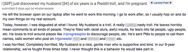 OOF. Awful. And any and all words connoting soul-crushing despair. In a post on Reddit, a woman who goes by the handle whatanasssss recounts how she found out her husband of six years is a “really fucking nasty” troll who preys on people on Reddit and Tumblr. And that’s just the start. Warning for some foul (troll-like) language below.