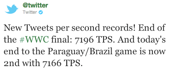 Whether or not you enjoy professional sports, or live in the United States and actually care about the sport the rest of the world incites riots over, over the weekend, the Women’s World Cup Soccer Final set a new Twitter record for tweets per second, at 7,196. By comparison, the Men’s World Cup Soccer Final last year set the largest period of sustained activity during an event with over 2,000 tweets per second during the last fifteen minutes, and when news of Osama Bin Laden’s death was being reported, Twitter hit 5,106 tweets per second. TechCrunch also points out that the 2011 Super Bowl hit 4,064 tweets per second, the day of the Japanese earthquake and tsunami in March hit 5,530 tweets per second, and the Royal Wedding in April hit 3,966 tweets per second. The previous all-time high of tweets per second was the 2010 New Years Eve in Japan, at 6,939.